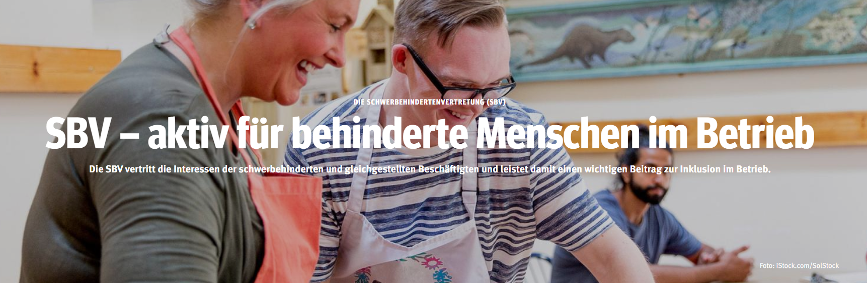 Die Schwerbehindertenvertretung (SBV) ist die gewählte Interessenvertretung der schwerbehinderten und gleichgestellten Beschäftigten im Betrieb. Sie wacht darüber, dass die geltenden Vorschriften zugunsten schwerbehinderter Menschen erfüllt werden, beantragt entsprechende Maßnahmen bei den zuständigen inner- oder außerbetrieblichen Stellen, nimmt Anregungen und Beschwerden von schwerbehinderten Menschen entgegen und wirkt beim Arbeitgeber auf deren Erledigung hin.