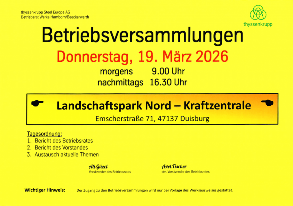 wir laden Sie und Euch herzlich zur Betriebsversammlung des Standorts Hamborn/Beeckerwerth ein.